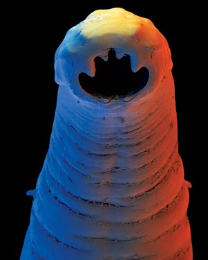 这种寄生线虫的生命开始于人体外,它通过受污染的水、水果和蔬菜进入人体。钩虫幼虫在人的内脏里生长,它们附着在寄主内脏壁上,吸寄主的血,有时会让寄主患上叫做肠虫病的贫血症。 症状:虚弱、腹痛、恶心、腹泻、贫血