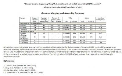 这篇题为“Human Genome Sequencing Using Unchained Base Reads on Self-Assembling DNA Nanoarrays”的文章报道了三个人类个体的基因组测序,其中两个属于国际HapMap计划——欧洲白种男性(NA07022),西非Yoruban女性(NA19240),除此之外还有一个来自个人基因组计划的白种男性(NA20431)的成淋巴细胞DNA样品。