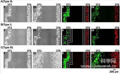 研究人员利用表面化学和微流控技术,通过选择性修饰基底的表面和控制自组装单层膜的扩散,实现了在同一基底上对多种细胞中任意一种或多种细胞的操纵。以两种细胞相互作用为例,我们可以固定两种细胞生长在各自区域,彼此不接触而通过可溶性细胞因子实现相互作用,我们称为第一种类型的细胞-细胞相互作用;也可以固定一种细胞,释放另一种细胞,观察被释放细胞在固定种类细胞作用下的迁移和生长,我们称为第二种类型的细胞-细胞相互作用;还可以将固定的两种细胞通过电化学解吸方法全部释放,观察两种细胞在迁移过程中彼此的相对运动和生长,我们称为第三种类型的细胞-细胞相互作用。另外,通过设计折线形微流孔道我们可以改变两种细胞间距,有利于观察距离对细胞相互作用的影响。