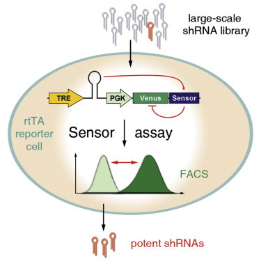 首先研究人员着手在2万个shRNAs中筛选,包括一些难以干扰的癌症基因在内的9个目标基因的启动发夹RNA分子,他们在一种逆转录病毒中插入这些候选RNAs分子,这种病毒也携带有目标基因(或者说是传感器),以及荧光蛋白基因。这样能确保当细胞被病毒入侵之后,目标基因和荧光蛋白基因,与shRNA能同时复制。