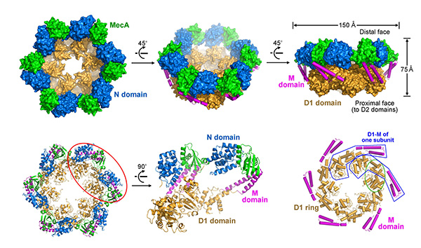 ATP依赖的可调控蛋白质水解广泛存在于大多数生命体中,对于及时清除机体内的垃圾蛋白以及调节蛋白具有十分重要的作用。原核生物中负责这一功能的蛋白酶体由调节亚基-Clp/Hsp100家族成员同催化亚基ClpP两部分组成。研究发现,Clp/Hsp100家族蛋白都是以六聚体形式执行功能。ClpC是Clp/Hsp100家族的重要成员,含有两个AAA+(ATPasesassociatedwithdiversecellularactivities)结构域(核酸结合结构域),与该家族其它成员不同的是,ClpC的六聚体形成及其进一步的激活需要接头蛋白MecA的参与。利用ATP水解的能量,激活后的六聚体MecA-ClpC分子能够去折叠特异性蛋白质底物,并将生成的去折叠多肽链转运到ClpP中降解。但是,MecA如何介导ClpC形成六聚体并激活ClpC的分子机制一直都没有明确的解释。