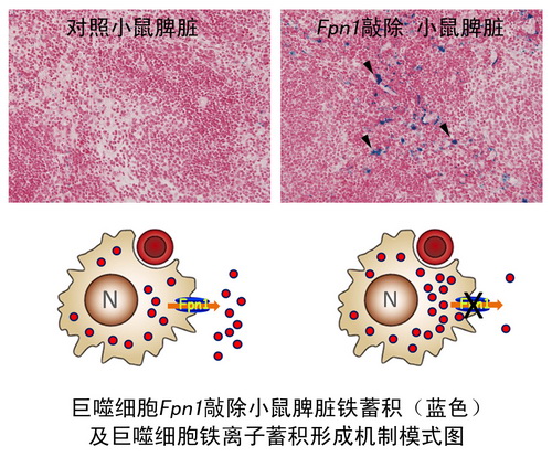 机体铁稳态代谢具有非常复杂而紧密的调控体系,在正常生理状态下,约5%的铁由肠道吸收满足人体日常生理需要,95%的铁来源于巨噬细胞,巨噬细胞吞噬裂解衰老的红细胞,然后将解离出的铁离子泵回血液中被再利用(Iron Recycling)。前期研究发现,Fpn1在巨噬细胞表达并可能参与细胞铁外排过程。Fpn1突变可以引发以器官铁蓄积为主要症状的人类遗传病——血色病,晚期多伴有肝硬化、糖尿病等并发症,但Fpn1在巨噬细胞参与铁稳态代谢中的分子机制目前还不十分清楚。