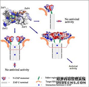 通过对ZAP蛋白活性区域的晶体结构测定工作,该研究首次揭示了一种同时含有四个CCCH类型锌指结构的蛋白质分子三维结构,为ZAP蛋白特异识别病毒RNA分子并发挥其抗病毒活性提供了准确的结构基础;通过一系列体内抗病毒实验以及体外与病毒RNA的结合实验,对ZAP蛋白N端结构域重要的RNA结合位点进行了验证,发现了ZAP蛋白表面含有一个由四个锌指结构构成的面积约300平方埃的、三维的特异性结合病毒RNA的区域;通过实验发现并证实了ZAP蛋白分子氨基端存在分子间相互作用,这种相互作用会促使ZAP蛋白在体内抗病毒过程中以二体形式识别并结合病毒RNA,这对抗病毒活性中起决定作用。同时,研究发现ZAP能够识别并抑制的RNA不仅可能存在特殊的高级结构,而且还含有两个ZAP结合区域,这就解释了为什么ZAP靶RNA都非常大。