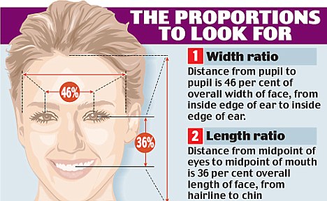 研究发现,当她的两个瞳孔之间的距离是两耳之间的面部宽度的一半(或者46%),两眼和嘴巴之间的距离是从发际线到下巴之间的整个脸长的三分之一(或者36%)时,她的吸引力最大。脸部比例符合这一标准的明星包括:好莱坞甜妞杰西卡·奥尔芭和加拿大著名乡村流行音乐天后仙妮亚·唐恩。然而发表在《视觉研究》(journal Vision Research)杂志上的报告说,这些比例还跟女性大众脸的比例相符。