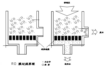 从活性碳吸附检出来的水再进入R.O反渗透过滤器。反渗透处理原理是由美国佛罗里达大学Reid等人在1953年提出的,而发展成一种实用技术是近几年的事。而且膜材料也从早期的醋酸纤维素非对称膜发展到现在的交联芳香族聚酰胺复合膜。它的原理如下图所示: 内容来自实验室前沿网站