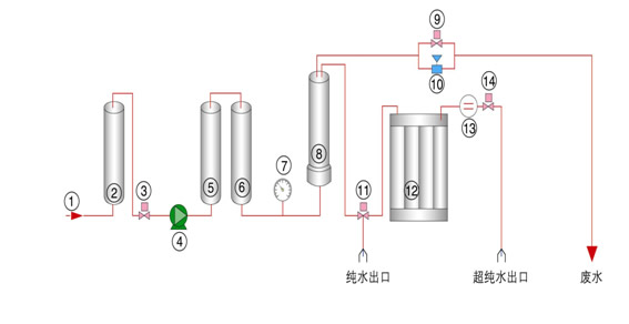 1:自来水三通阀; 2:PP棉滤芯; 3,9,11,14:电磁阀; 4:增压泵; 5:碳粉滤芯; 6:碳棒滤芯;7:压力表8:R.O膜10:比例调节阀;12:离子交换柱13:电导池