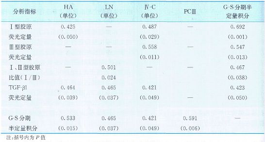 Ⅰ、Ⅲ型胶原以红、绿双色荧光通道扫描观察,绿色荧光的激发波长为488nm,在;30nm波长以上观察,红色荧光的激发波长为543nm,在;60nm波长以上观察。每张切片选取10个视野观察,并由计算机自带扫描分析软件测定荧光强度与荧光面积。上述指标的荧光值=平均荧光强度×平均荧光面积。研究结果显示:经FITC和TRITC免疫荧光双重染色的Ⅲ型胶原阳性表达为绿色荧光;I型胶原阳性表达为红色荧光。慢性肝炎、肝硬化患者Ⅰ、Ⅲ型胶原的表达大量增加,在门管区、血管壁周围及炎性坏死区均可见到I、Ⅲ型胶原表达增加,并向肝小叶内延伸。分隔包绕肝小叶;肝组织Ⅰ、Ⅲ型胶原表达的荧光定量、G-S分期积分和已检测的血清肝纤维化指标,如透明质酸(HA)、层黏连蛋白(LN)、Ⅲ型前胶原(PCⅢ)和Ⅳ型胶原C(n-—C)相关性分析得出结论:在慢性肝炎和肝硬化时,上述研究指标均呈显著相关性。由此说明此种方法的荧光定量分析能准确地量化肝组织纤维化程度,对患者的治疗和预后有指导性意义。