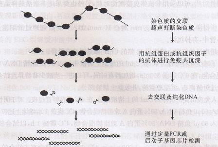 ChIP是目前确定与特定蛋白结合的基因组区域或确定与特定基因组区域结合的蛋白质的最好方法(见下图),也可用于分析与转录、有丝分裂或DNA损伤相关的发生改变的组蛋白修饰。ChIP技术和芯片技术的结合有利于确定全基因组范围内染色体蛋白的分布模式以及组蛋白修饰情况。该技术主要应用于:①组蛋白修饰研究;②转录调控分析;③药物开发研究;④有丝分裂研究;⑤DNA损失与凋亡分析。ChIP是深入分析癌症、心血管疾病以及中央神经系统紊乱等疾病的主要代谢通路的一种非常有效的工具。