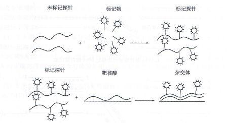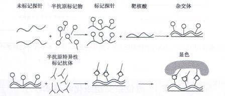 根据探针的标记物是否能直接检测,原位杂交又可分为直接法和间接法两类。在直接法中。探针用放射性核素、荧光素或一些酶标记,探针与组织细胞内靶核酸所形成的杂交体可分别通过放射自显影、荧光显微镜或酶促呈色反应而直接显示。直接法原位杂交操作步骤少,所需时间短,但由于没有杂交信号的放大,对一些低拷贝的靶序列检测的敏感性不够。间接法一般都用半抗原标记探针,最后通过免疫组织化学或亲和组织化学反应对半抗原定位,间接显示探针与组织细胞内靶核酸所形成的杂交体。间接法原位杂交敏感性较直接法高,是最常用的原位杂交方法,荧光原位杂交也可用间接法进行。