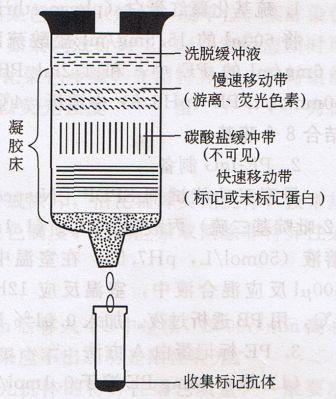 ⑤过柱 取透析过夜的标记物,通过葡聚糖凝胶SephadexG-25或G—50柱,分离游离荧光素,收集标记的荧光抗体进行鉴定。洗脱液:0.01mol/L磷酸盐缓冲液(pH7.2);过滤量:12ml标记全球蛋白液(过滤前未透析);收集量:20ml(稀释1.7倍左右)。