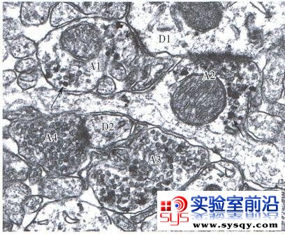 环氧树脂包埋前免疫纳米金染色示亨廷顿蛋白相关蛋白(huntingtin-associated protein 1.HAP1)在小鼠脑内神经元轴突终末内突触囊淮上的定位(A1—A3,含HAP1的轴突终末:A4,无HAP1的轴突终末;D1和D2,树突。箭示纳米金一银颗粒)
