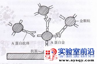 光学显微镜下观察,小肠黏膜内含有嗜银颗粒的细胞胞浆呈红色,阳性颗粒位于细胞核底部,比单纯用PAG染色深度得到加深,阳性结果得到放大。由于抗A蛋白抗体既能通过Fab段又能够通过Fc段与PAG上的A蛋白结合,因此,与其他桥抗体相比它能够在抗原位点处聚集更多的胶体金颗粒。基本原理如图。