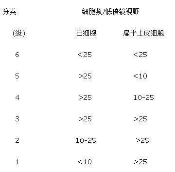 *分类中1~3类不做培养,要求重新留取标本:4、5类为合格标本:6类为气管穿刺液,如未见到白细胞,而扁平上皮细胞>10/低倍镜视野,亦应重新留取标本。 内容来自实验室前沿网站