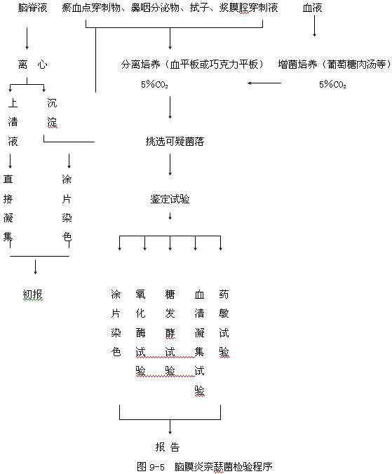 分离培养 血液或脑脊液先增菌后,再接种巧克力平板,5%CO2、37℃18~24h后可形成圆形、凸起、光滑、湿润、灰褐色菌落。挑取可疑菌落涂片染色检查,并进一步作生化试验等鉴定。