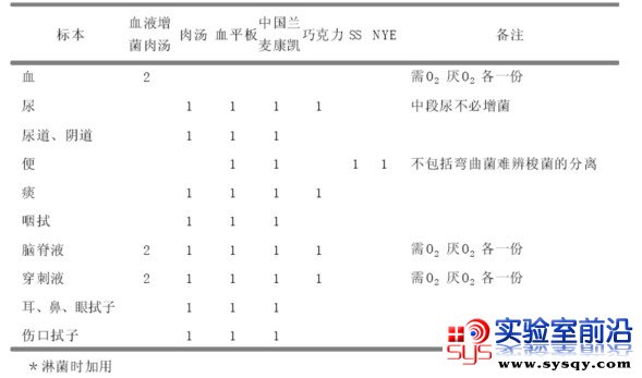 各种标本初分离应选用的培养基类别参见下表。