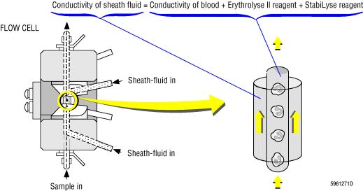 下图中从sample in流进的血液,只有原态大小的白细胞。这是因为,由分血片采集到的用于五分类的28微升血样,先与Erythrolyse溶血素试剂混合,其中的红细胞和血小板被pak lyse胀破溶解掉,同时所有的白细胞也已经涨大,但它们马上又与Stabilyse(pak preserve)溶血素混合,将涨大的白细胞收缩回原态大小。